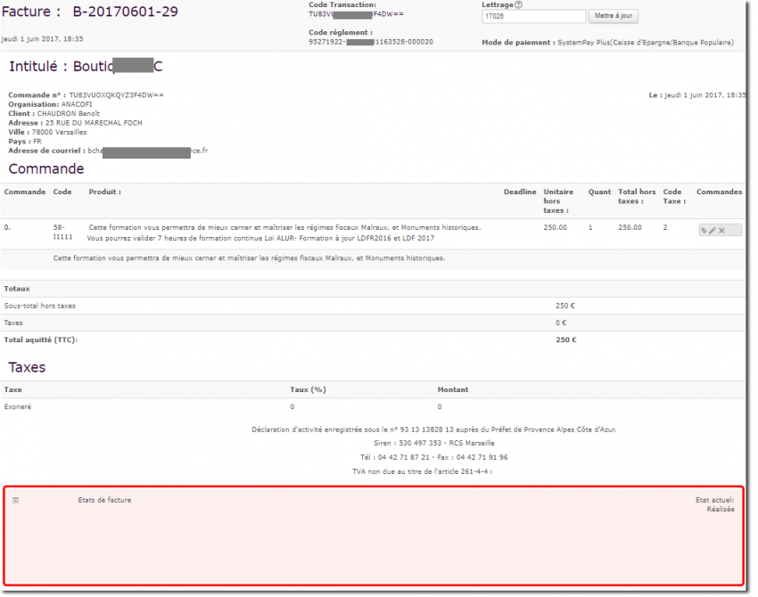 En cliquant sur une transaction affichée dans le bloc, vous afficherez la facture qui est en état réalisée (COMPLETE), et qui présente un lien vers une version imprimable via l'impression du navigateur, de la facture.