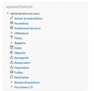 Par exemple, le bloc Administration a été ajouté par l'administrateur local. (cf. copie d'écran ci-dessous) Il existe de nombreux blocs sur Moodle.