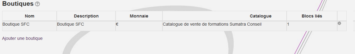 Toutes les boutiques : Ce menu permet de créer une autre instance de boutique avec son catalogue et de voir combien de bloc sont attachés à chaque instance. Les boutiques sont des instances de vente appuyées sur un catalogue et opérant selon certaines modalités. Pour créer une boutique, cliquez sur le lien “Ajouter une boutique”. Pour modifier une boutique existante, cliquer sur la roue crantée en fin de ligne de la boutique crée. Pour supprimer une boutique existante, cliquer sur la croix en fin de ligne de la boutique crée.