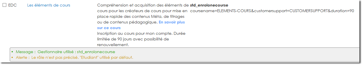- Vous obtenez un avertissement en orange pour vous signifier que n'ayant pas précisé dans le gestionnaire produit de rôle à affecter à l'acquéreur, le rôle étudiant par défaut sera appliqué.