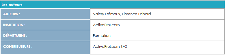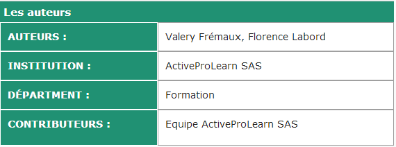 Cet élément de cours est particulièrement utile pour la mise en lumière du ou des auteurs du cours, ainsi que des contributeurs éventuels, notamment dans le milieu de l'enseignement supérieur.