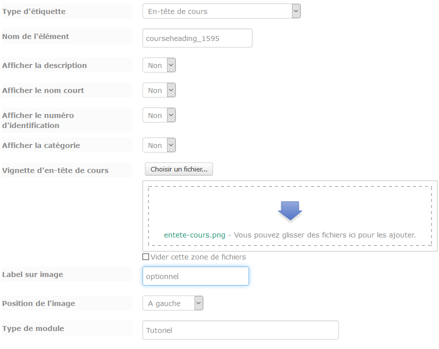* Afficher le nom court : Si coché renseignera le nom abrégé (shortname) du cours * Afficher le numéro d'identification du cours : Si coché renseignera le numéro d'identification du cours * Afficher la catégorie : Si coché renseignera la catégorie ou est rangé le cours * Vignette du cours : Faire glisser une image pour illustrer votre cours * Label sur image : Un texte qui apparaitra sur l'image * Position de l' image : Au choix droite, gauche ou pas d'image * Type de module : Permet de renseigner une typologie de cours, de type : cursus, module, démonstrateur, tutoriel ou la typologie de votre choix