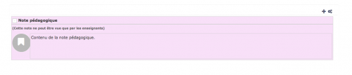 La note pédagogique est utilisée pour guider les utilisateurs. Elles s'adressent en général à des enseignants si ils souhaitent réutiliser le cours d'un autre enseignant, par exemple, cet élément de cours permet d'apporter des commentaires pédagogiques concernant la structure. Elle permet à l'enseignant d'ajouter des informations sur la structure pédagogique du cours qu'il a mis en place.
