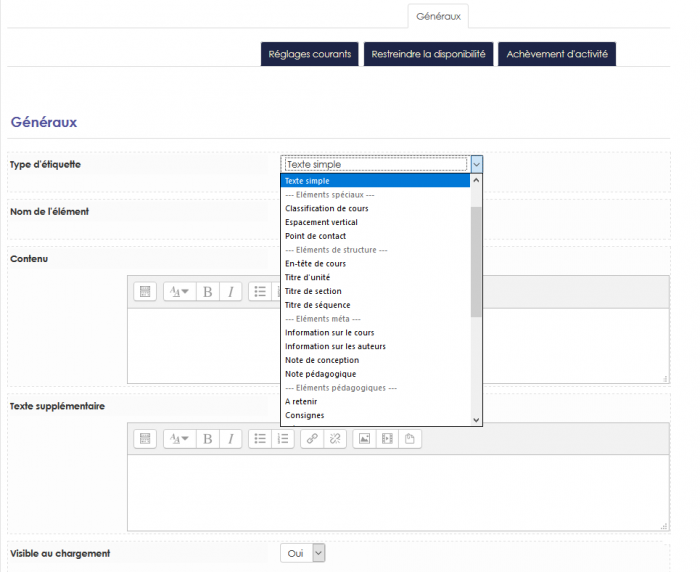 • Dans l'écran qui apparait au rechargement de la page, choisissez quel type d'élément de cours vous souhaitez ajouter au cours dans la liste déroulante en regard du Type d'étiquette :
