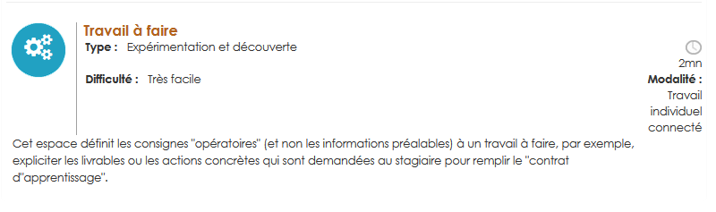 L'élément de cours “Travail à faire” précise les consignes opératoire d'une activité. En effet, plusieurs options permettent d'indiquer le cadre dans lequel va s'inscrire une activité.