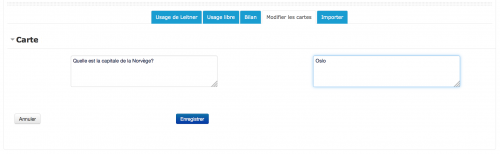 Ce que vous rédigez dans l'espace de gauche apparaitra au dos de la carte. Ex : “Quelle est la capitale de la Norvège?”