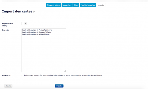 Cet écran permet d'intégrer simplement des questions et des réponses. Si vous disposez déjà d'un fichier texte contenant questions et réponses, il vous suffit de copier/coller le contenu du fichier dans l'espace. :!:Il est nécessaire de vérifier quel séparateur de champs vous avez utilisé.
