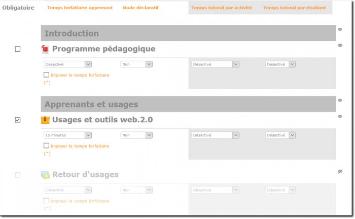 Colonne 1 : Temps forfaitaire apprenant : Temps affecté à une activité ou ressource (Liste déroulante).