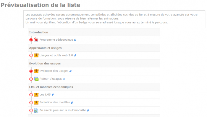 Rendu visuel coté étudiants des activités tracées par le LTC. Les activités cochées sont celles effectuées par les étudiants.