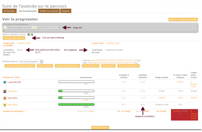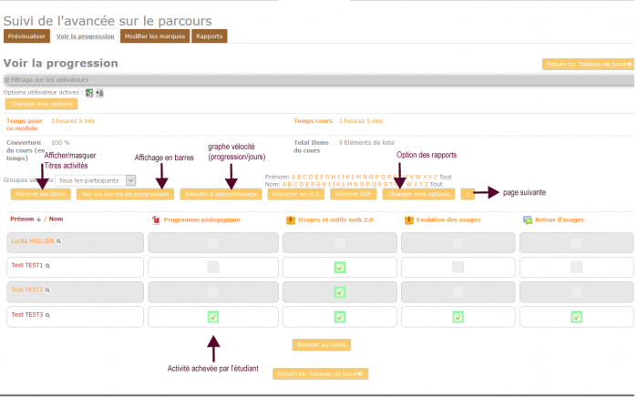 Ce menu permets un affichage de la progression, avec un lien sur les noms utilisateurs, et un affichage possible par groupes.
