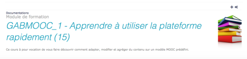 Dans cet exemple, nous avons sélectionné “oui” dans la liste déroulante des paramètres 3. (description du cours : Ce cours a pour vocation de vous faire découvrir comment adapter, modifier et agréger du contenu sur un modèle MOOC prédéfini.), 4.(le nom abrégé du cours : GABMOOC_1), 5.(le numéro d'identification : 15) et 6.(la catégorie : Documentations) (voir le paramétrage ci-dessous). Une vignette a été ajoutée dans le paramètre 7. Nous avons sélectionné “A droite” dans Le paramètre 8. concernant la position de l'image.
