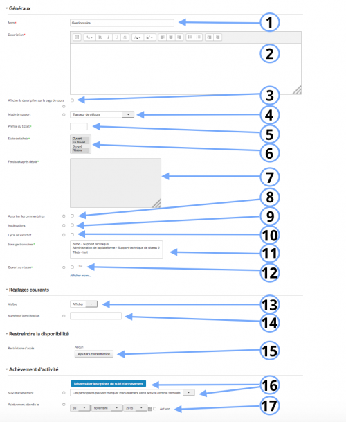 16.L'achèvement d'activité peut être inactif. Dans ce cas, sélectionner “ne pas afficher l'état d'achèvement”. Sinon, l'activité peut être considérée comme achevée si elle est marquée manuellement cette activité comme terminée“,” marquer cette activité comme terminée dès que les conditions sont remplies“